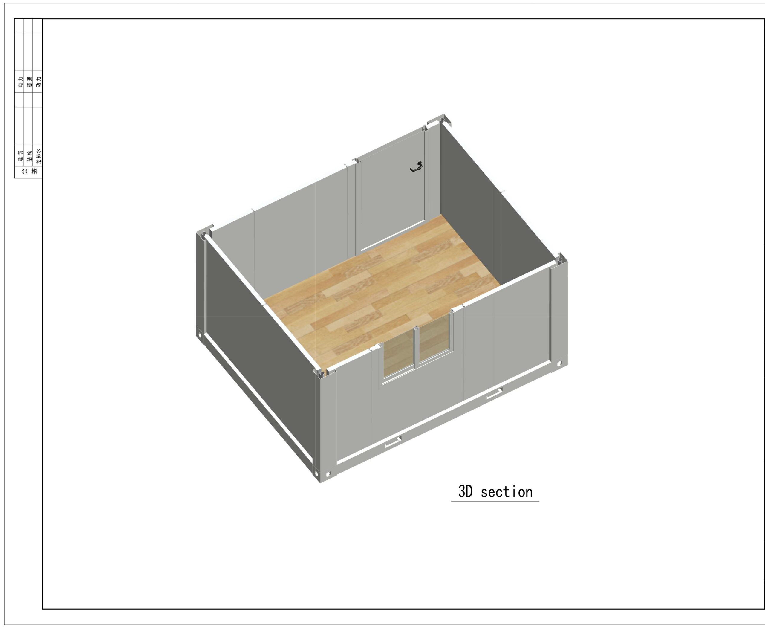 4. Sol : sol en PVC de 1,8 mm (type grain de bois) + panneau en fibrociment de 18 mm + isolation en laine de roche de 100 mm + étanchéité de 0,4 mm, tôle (tôle d’acier colorée : aluminium zinc magnésium AZM100g/m2 + peinture de cuisson PE : 20/5um)